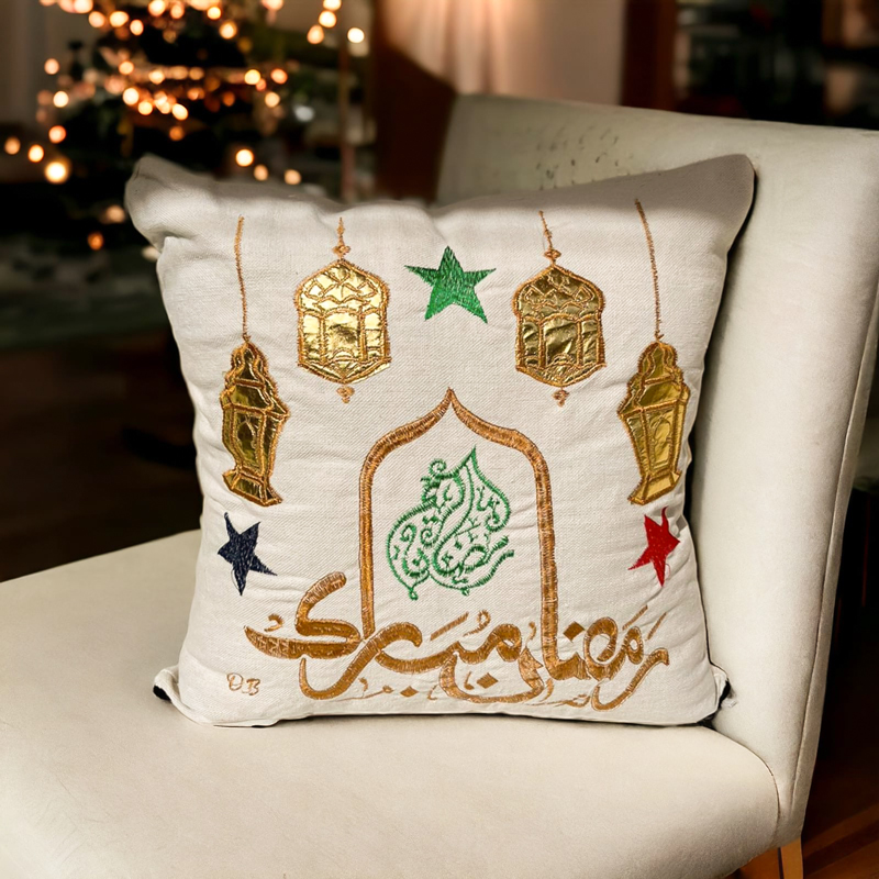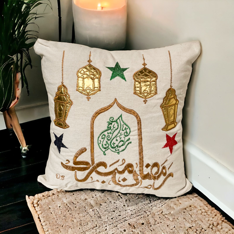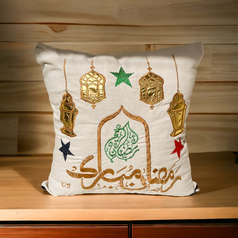 اكياس مخدات مطرزة بكلمة رمضان مبارك وفوانيس ونجوم لتجديد ديكور البيت من الكتان