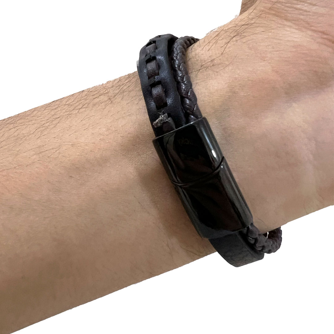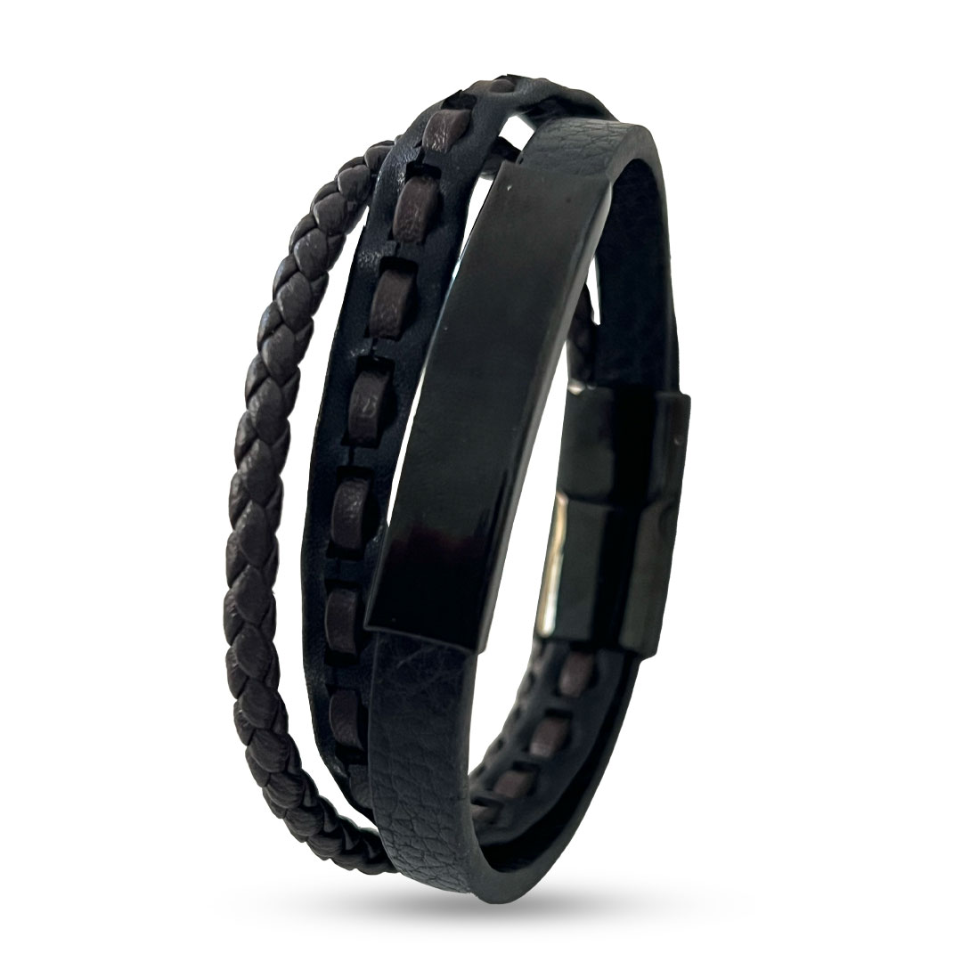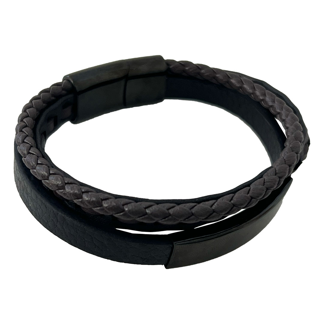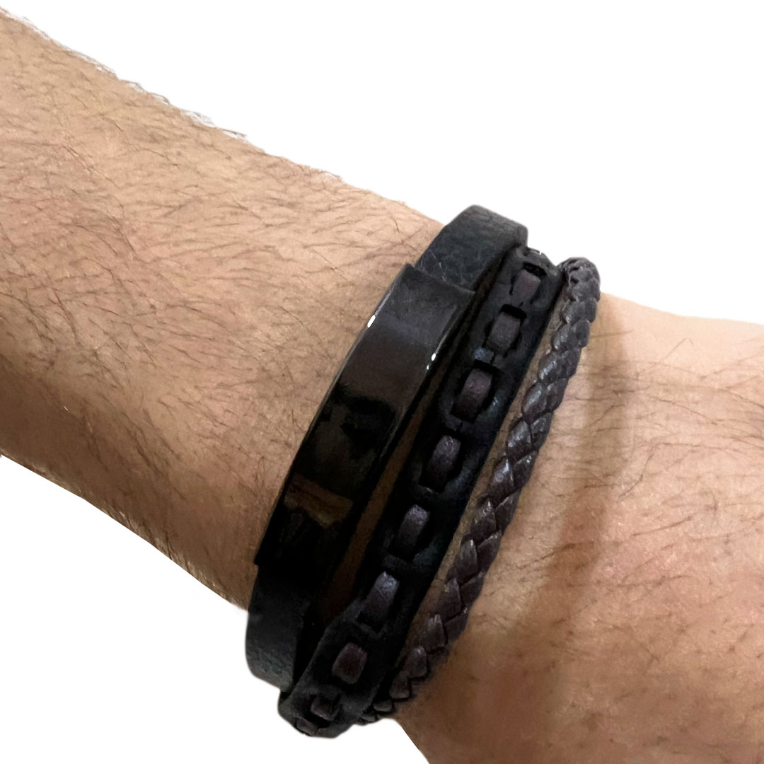 بريسليت رجالي 3 لفات بأشكال مختلفة جلد مضفر وسادة بقفل معدن باللون الاسود الملكي