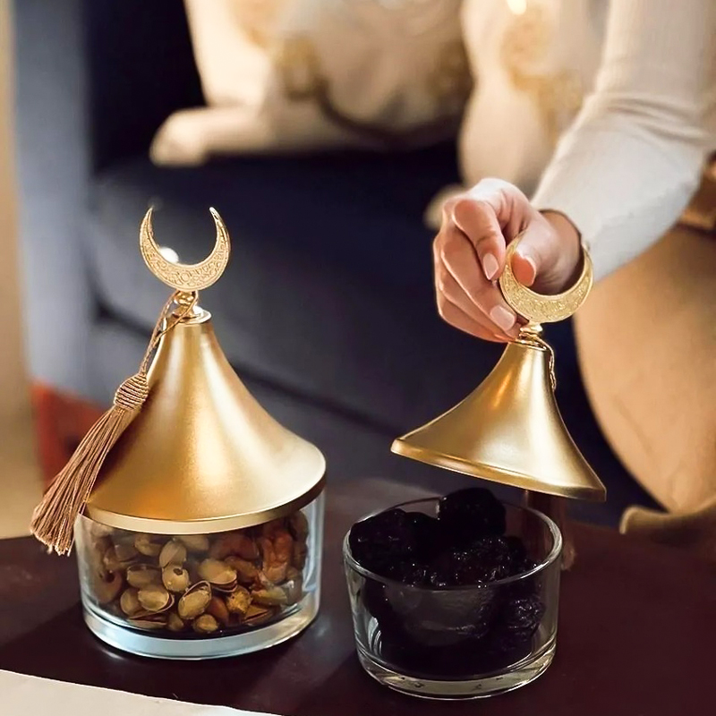 تمرية زجاج بغطاء ذهبي مزين بهلال لحفظ وتقديم التمر والمكسرات للضيوف بشكل شيك