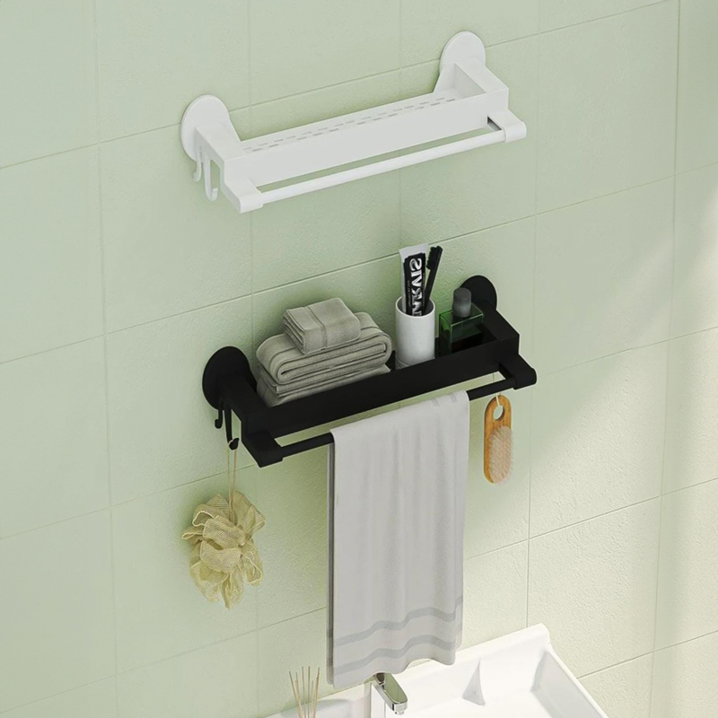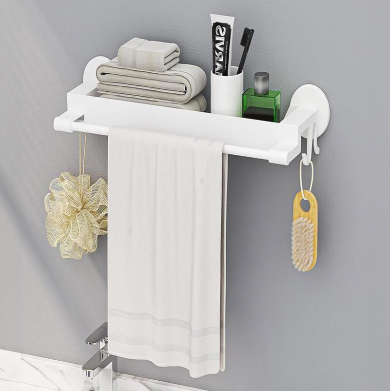 رف لحمل وتنظيم ادوات الحمام مع حامل للفوط و 2 هوك لتعليق الليف والفرش بلزق دبل فيس قوي