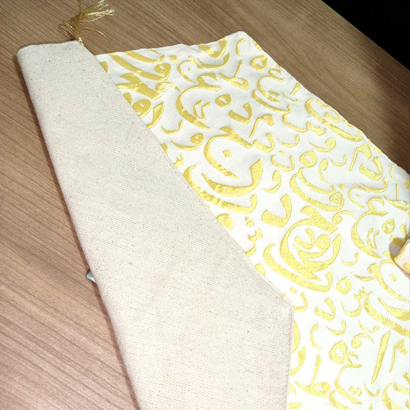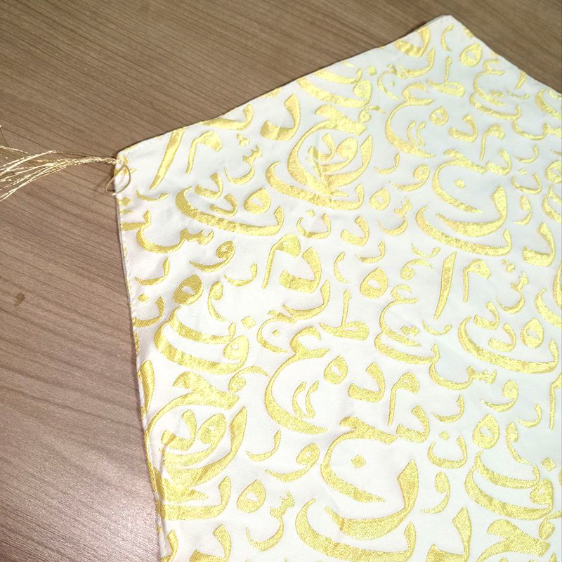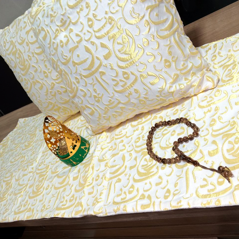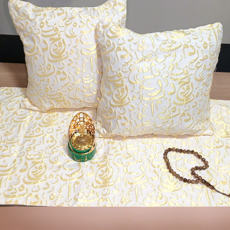 طقم رمضاني 3 قطع رانر مع 2 كوشن بتصميم حروف عربية جولد لديكور رمضاني مختلف