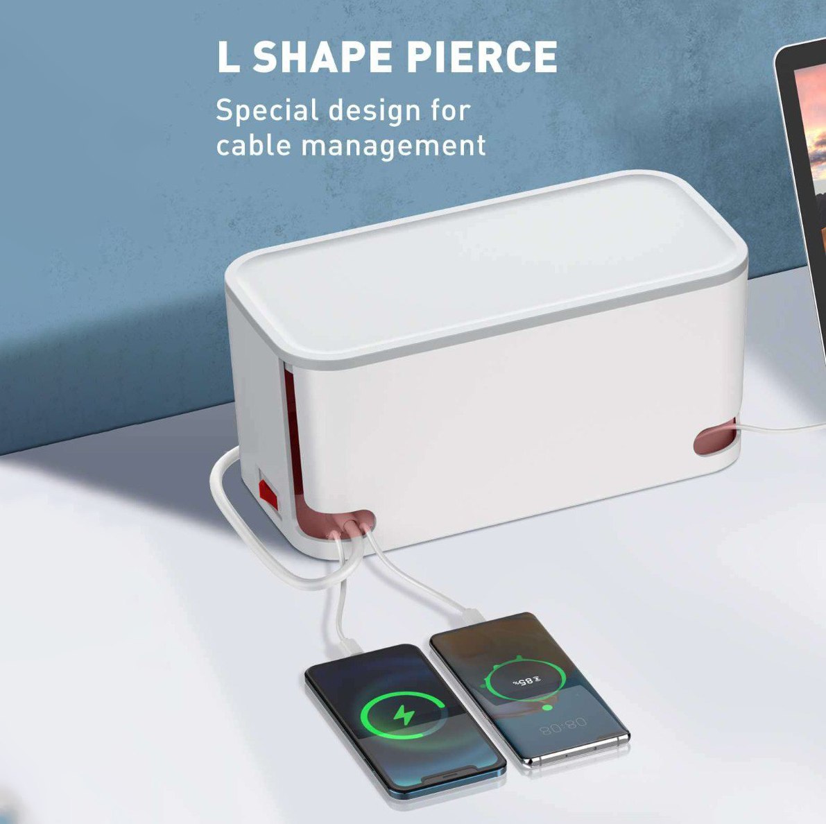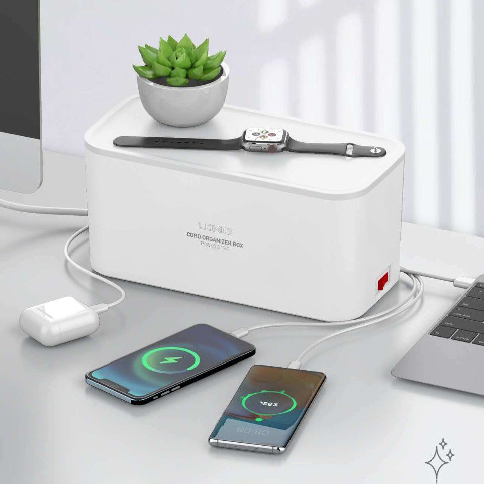 مشترك كهربائي و شاحن ببوكس منظم للاسلاك وستاند للهواتف و الأجهزه بفتحات للتهوية ويمكن استخدام المشترك بدون البوكس