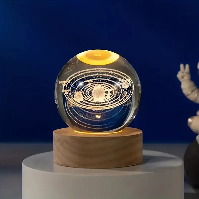 بلورة كريستال ثلاثية الابعاد بتصميم المجموعة الشمسية بقاعدة خشبية قابلة للفصل