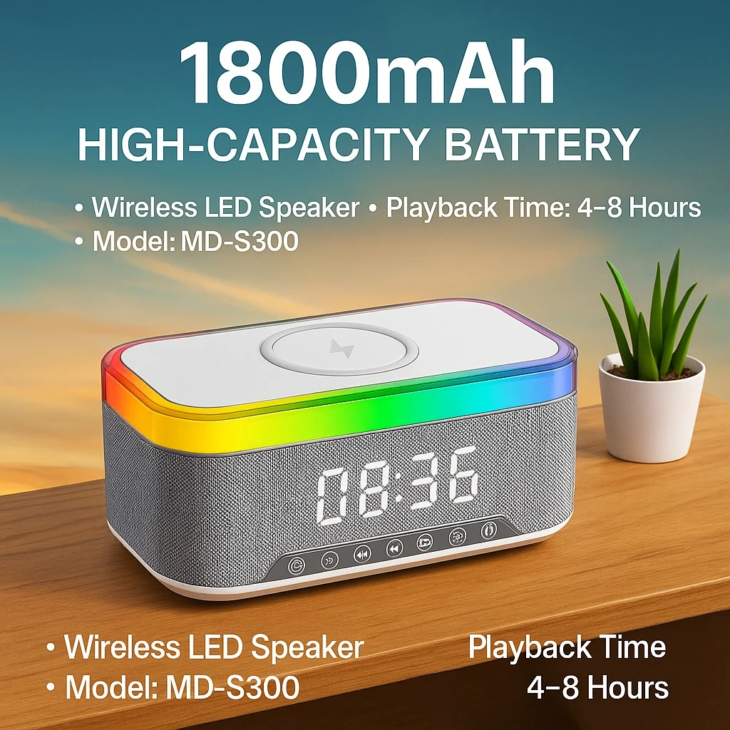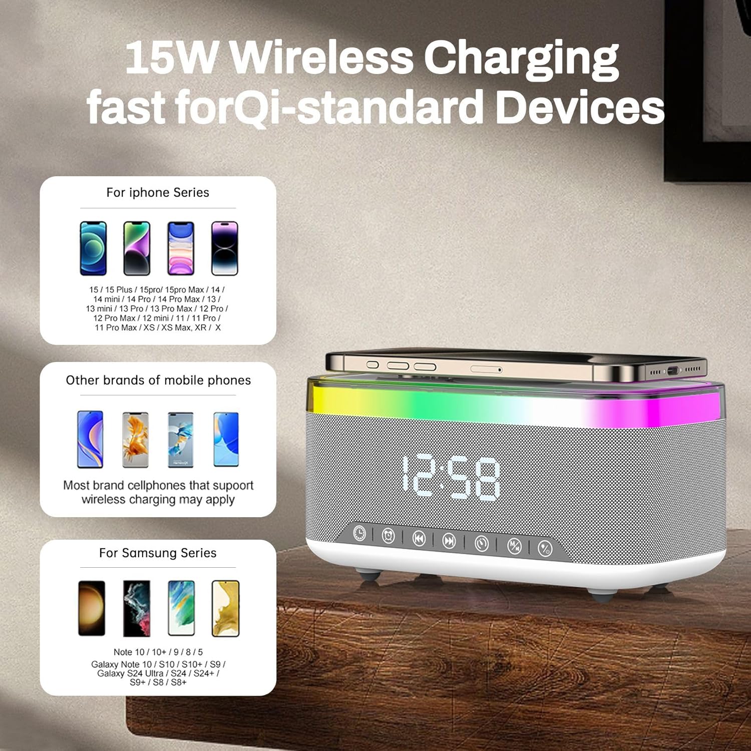 سبيكر بلوتوث 6 * 1 مع شاحن لاسلكي وساعة ومنبه وراديو بإضاءة ليد 7 ألوان مختلفة