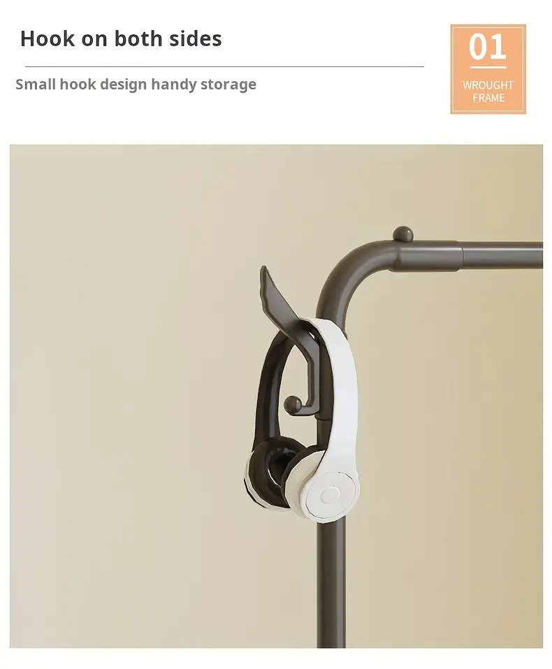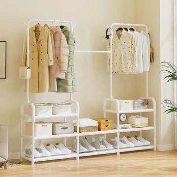 ستاند ملابس مزدوج ب 4 ارفف لتنظيم الاحذاية ومزود ب 4 هوك جانبية لتعليق الشنط