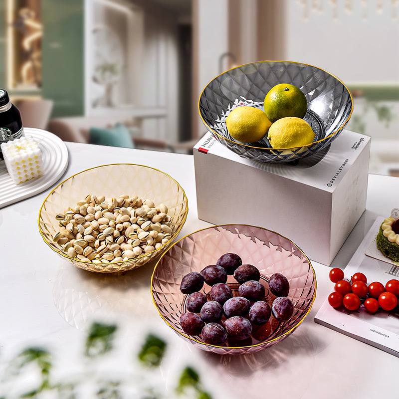 طبق اكليريك بحواف ذهبي وقاعدة دواره لحمل وتقديم الفواكه والمكسرات والشوكولاتة بشكل شيك