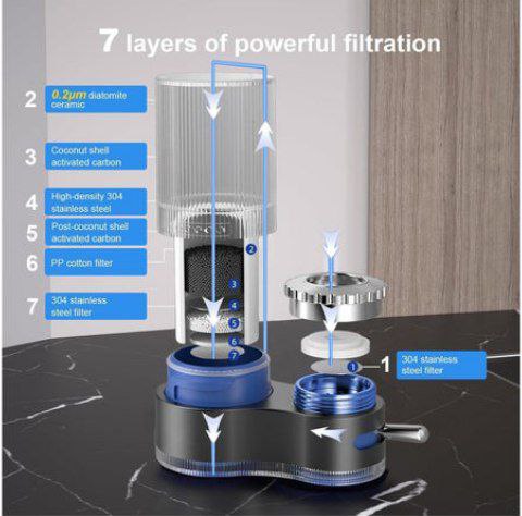 يقوم الفلتر بالترشيح على سبع مراحل فلتر الكربون المنشط المصنوع من السيراميك يزيل الكلور والروائح والطعم والرصاص والفلورايد والملوثات الأخرى