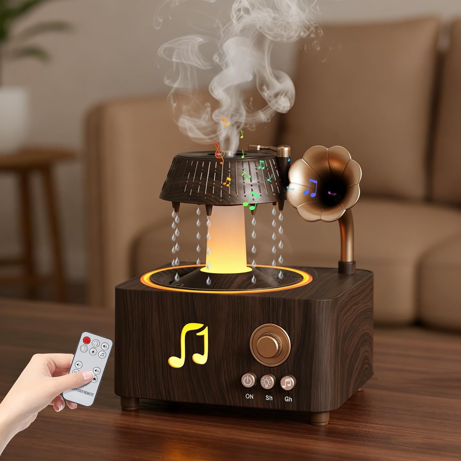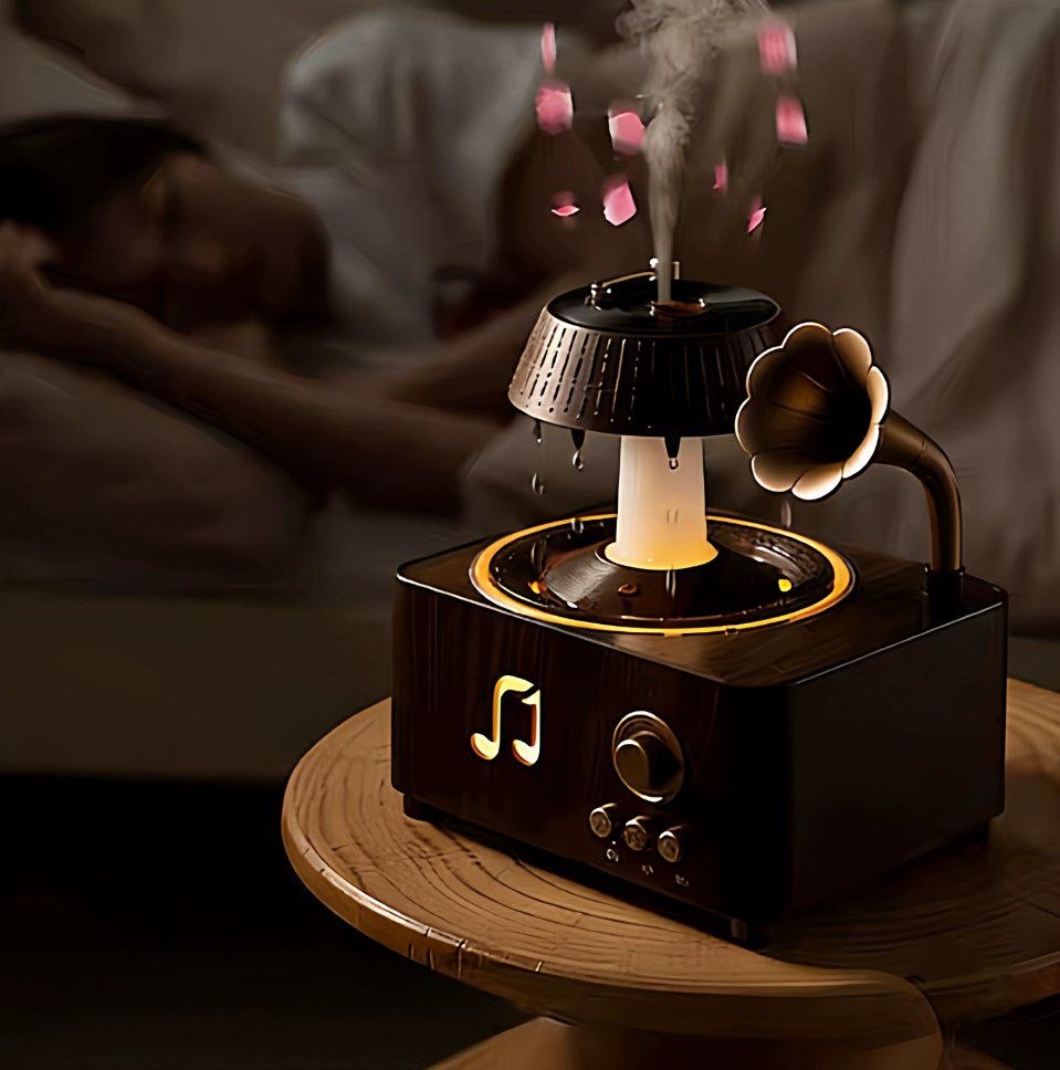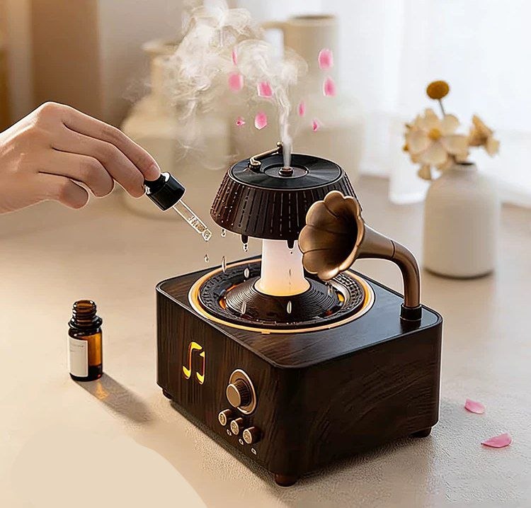 فواحة مضيئة على شكل جرامافون مع صوت ضوضاء بيضاء وسبيكر بلوتوث بخزان 250 ملي لتعطير المنزل بريموت للتحكم