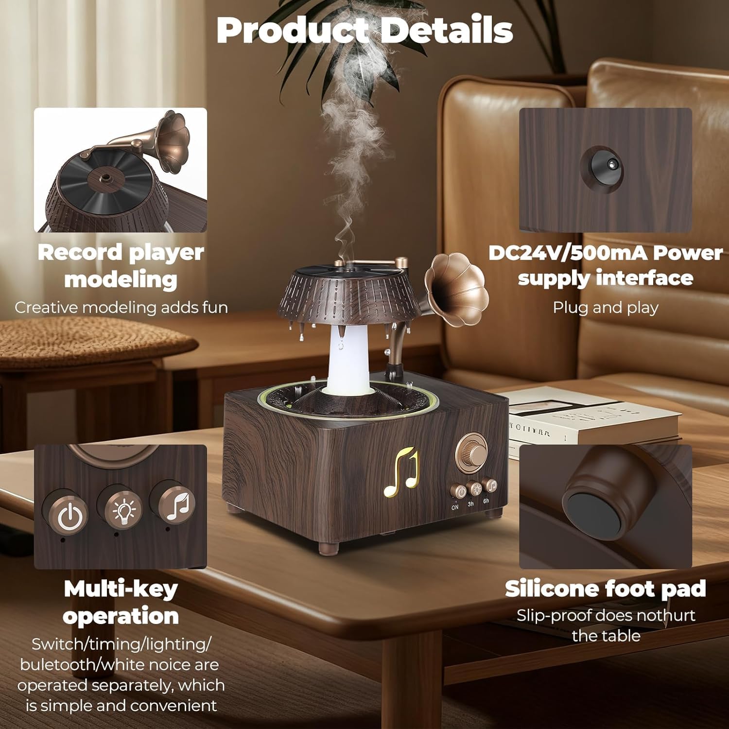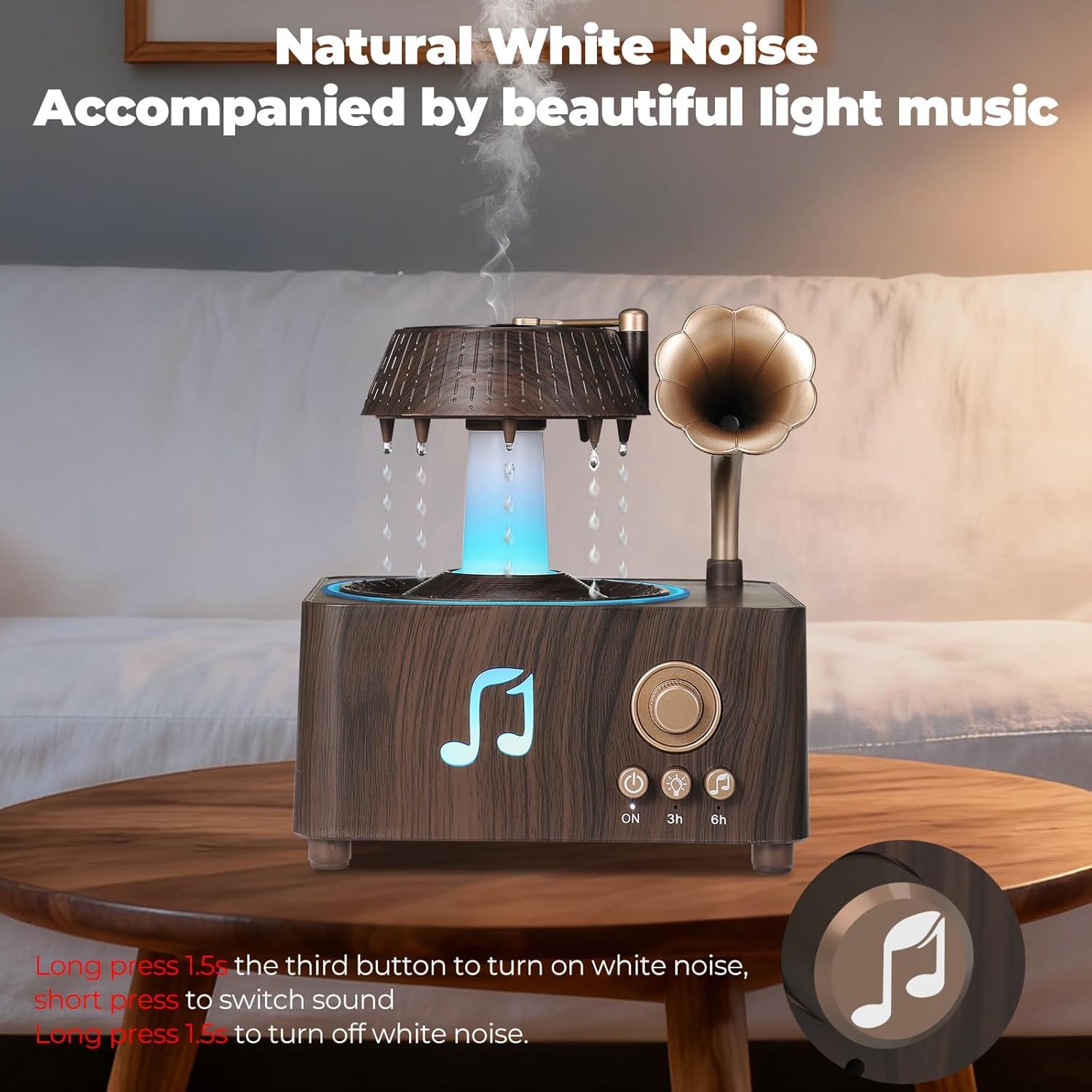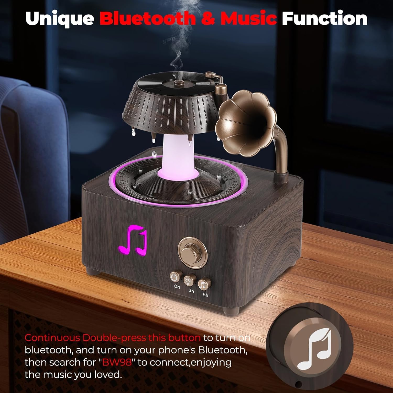 فواحة مضيئة على شكل جرامافون مع صوت ضوضاء بيضاء وسبيكر بلوتوث بخزان 250 ملي لتعطير المنزل بريموت للتحكم