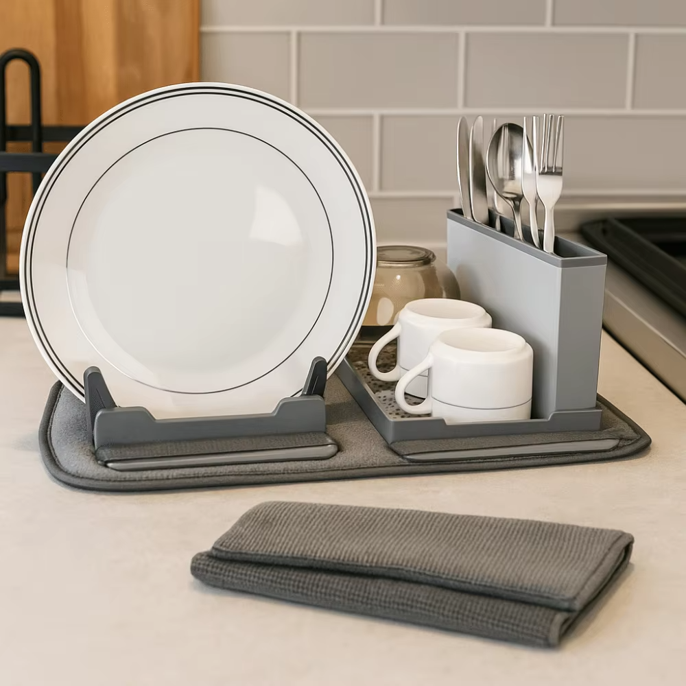 مفرش مايكروفايبر مع مصفاة للاطباق والاكواب وجزء لتصفية الشوك والمعالق