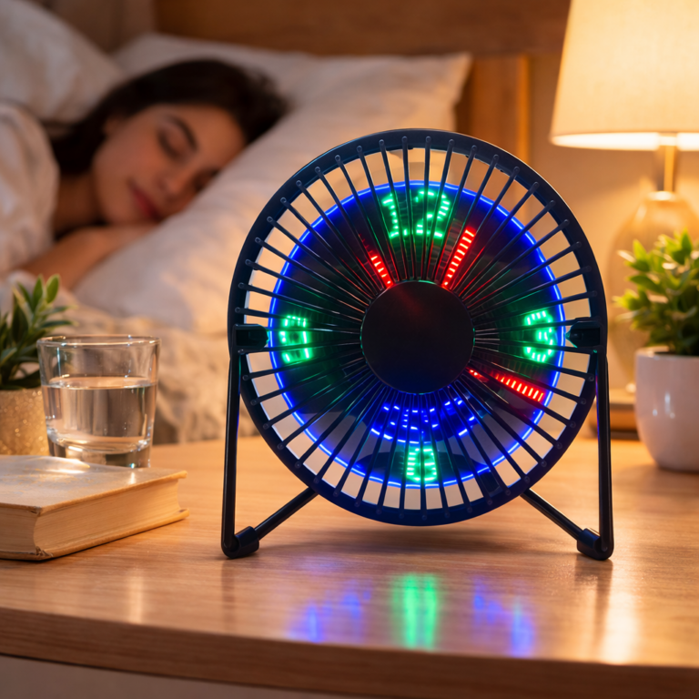 مروحة ليد مكتب بساعة رقمية تدور 360 درجة تعمل بالشحن