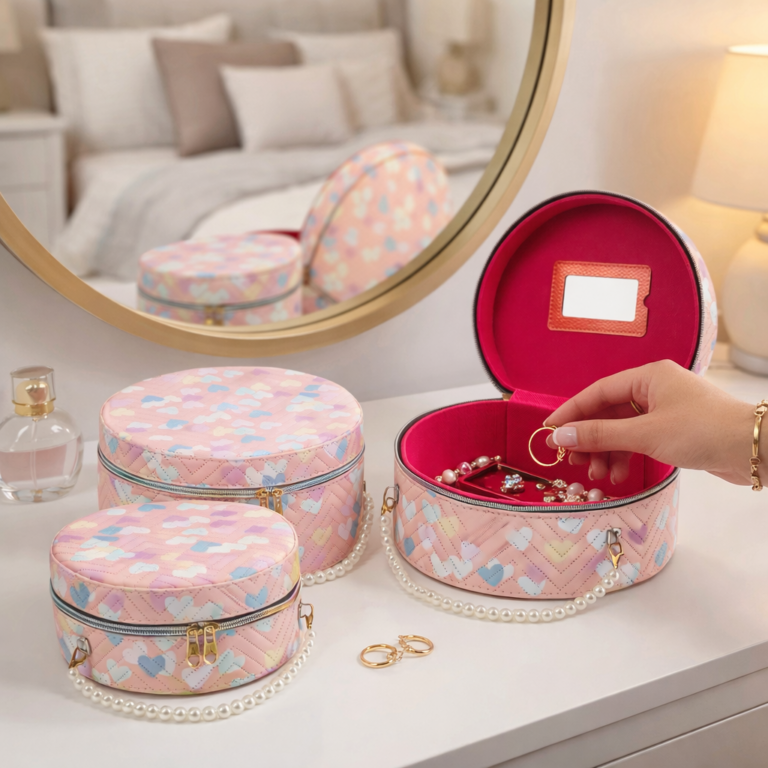 مجموعة شنط جلد 3 قطع بماقسات مختلفة لتنظيم وحمل الميك اب مزينة بقلوب